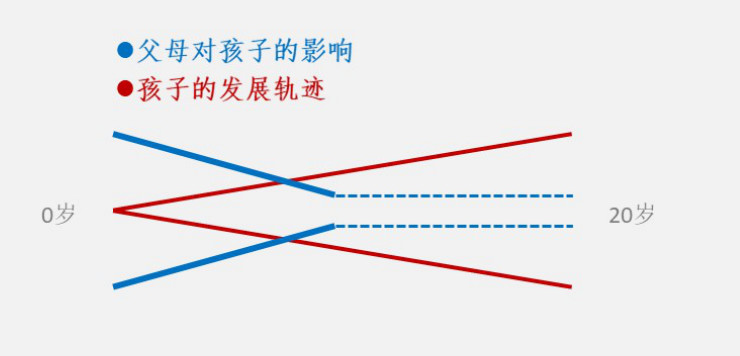 蓝色线是父母对孩子影响,在儿时父母对孩子影响是最大的,但是等到孩子进入到青春期