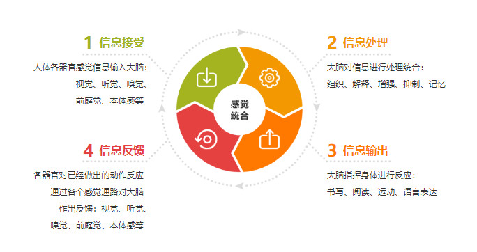 而运动力的另一个方面就是感觉运动统合能力,是指将人体器官各部分感觉信息(如视觉、听觉、触觉、嗅觉、前庭觉和本体觉等)输入组合起来,经大脑处理(解释、比较、增强、抑制、联系和统一),对身体外的知觉做出反应,并反馈指导行为、语言、思维等的能力。