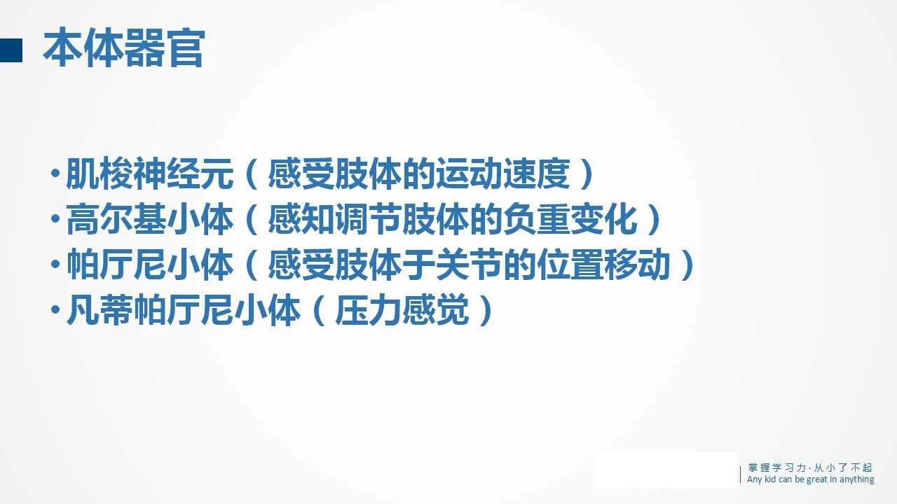 本体器官存在于全身各处的肌腱、关节、韧带、口腔粘膜等处。本体器官能感觉肢体活动的速度、负重、压力、位移等。前庭器官有“三兄弟”,本体器官也有“四大金刚”,它们各司其职,分别接收速度、负重、压力、位移这些感觉(详见下图)。
