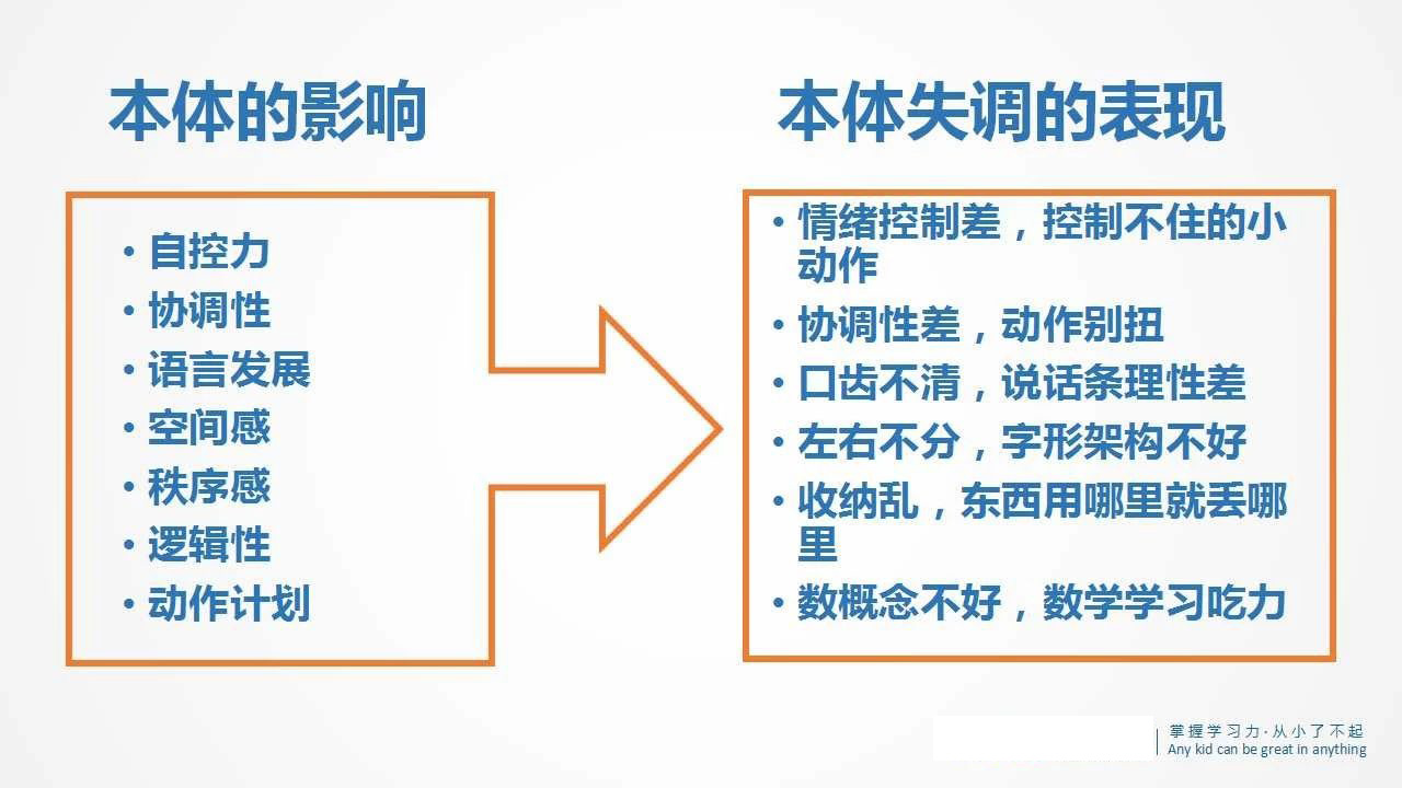 感觉统合能力出了问题,就像是一台电脑,当你通过键盘、鼠标输入信息,信息传给主机进行处理,然后通过屏幕显示处理结果。若在这过程中,鼠标反应迟钝,移动鼠标时屏幕上的光标不按指示移动,那么使用电脑就变得很困难。