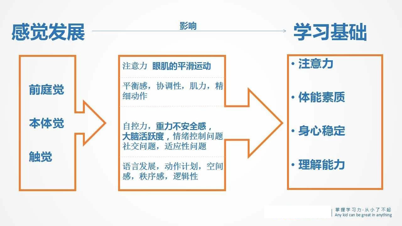 通过了解这个三个感觉通路后,相信大家就更加了解它们是如何影响并作用于孩子的学习基础。