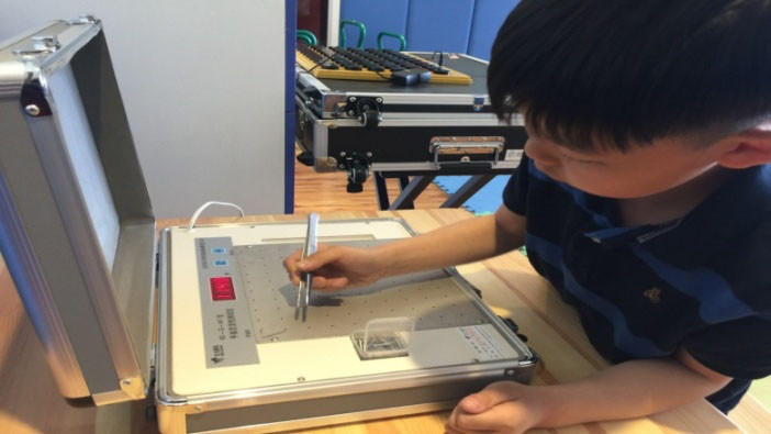 如下图↓,这也是专业感统器材,板上共有100个小洞,一旁的小盒里有100根小刚棍,在尽可能短的时间内,孩子写字的惯用手握住镊子把小棍夹出,再扎进小洞里,同时仪器会记录用时。