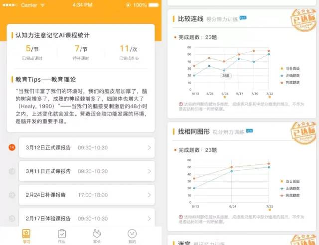 不仅有海量的,数以千万计的训练项目组合, 每一个孩子还能得到两个老师的同时监督指导。通过线上测评,能够匹配符合孩子学习能力的训练方案,每次训练的结果,能进行图表化呈现,在家陪娃一起训练,见证孩子一步一步的成长,也是作为父母,最有成就感的事情!
