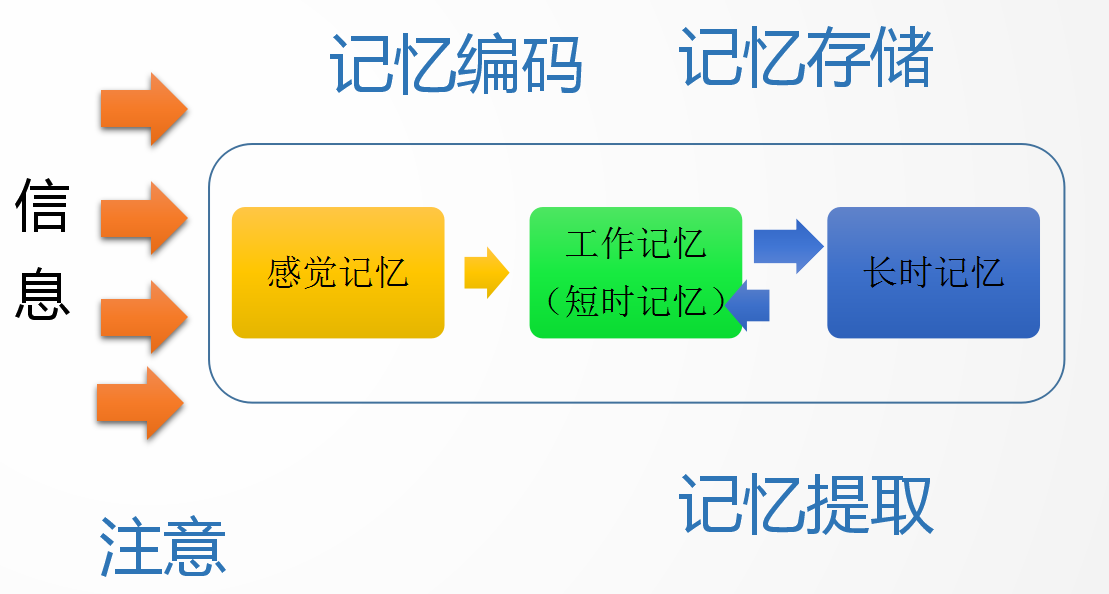 首先信息通过眼、耳、口、鼻等等各个感觉通道进入到神经系统中形成感觉记忆,接着到了工作记忆阶段,感觉记忆与工作记忆都属于短时记忆。