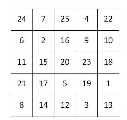在一张有25个小方格的表中,将1到25的数字打乱顺序,填在表中,然后以最快的速度从1数到25,边读出边指出数字。7到8岁孩子按顺序找出每张图表上的数字,时间是30到50秒;成年人看一张图表的时间大约是25到30秒。