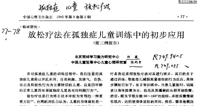 ▲Mr.蔡,张雨青(1995):放松疗法在孤独症儿童训练中的应用:附三例报告,中国心理卫生杂志,9(2),77-80.