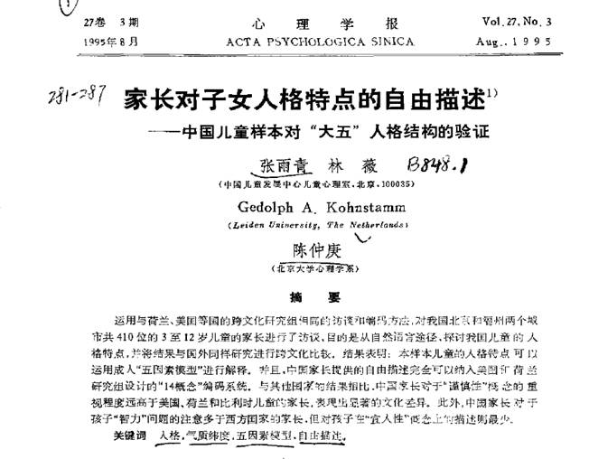 ▲张雨青,Mr.蔡,Kohnstamm,G.A.,陈仲庚(1995):家长对子女人格特点的自由描述——中国儿童样本对“大五” 人格结构的验证,心理学报,27(3),281-287.