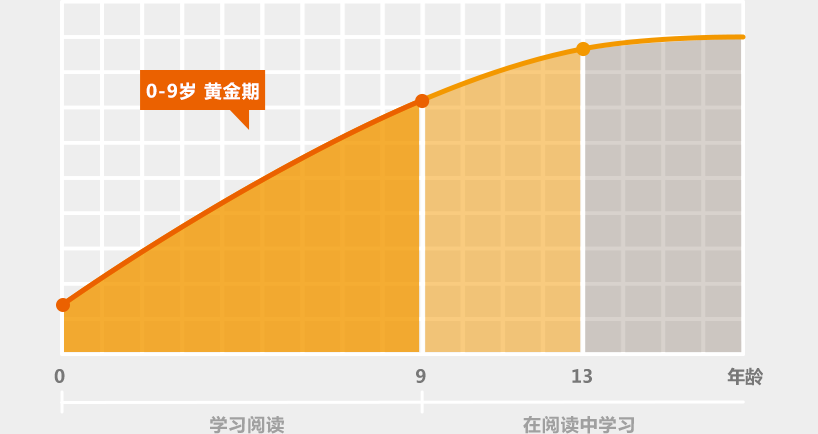 9岁以前,儿童阅读能力发展的第一阶段:“学习阅读”。这个阶段的孩子具有了文字概念,具备能够把文字符号转化为语言符号来获取意义的能力,这项能力就是孩子能否为适应正规校园生活、从课本获取知识的基础能力。因此,我们把9岁之前称为培养阅读能力的黄金期。而9岁-13岁,儿童阅读发展进入了“在阅读中学习”阶段,孩子需要良好的阅读理解力不断吸取课本、板书的知识。在这个阶段阅读理解能力强的孩子能够更加迅速地积累知识,增强自己的优势,在此阶段不断巩固阅读理解力也十分关键。